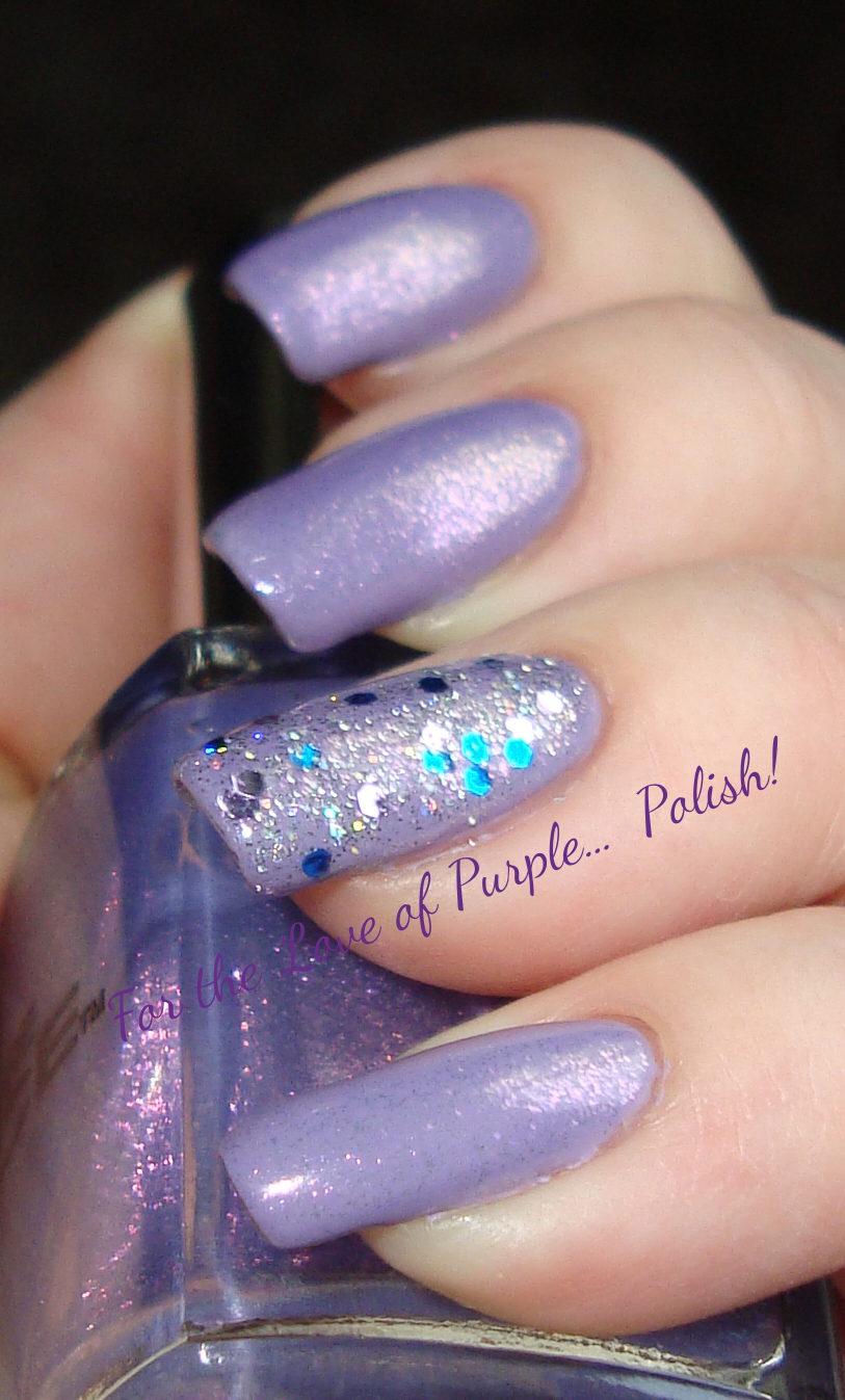 I started out with 2 coats of Avon's Loving Lavender (this is fast becoming my favorite go-to purple polish) It is such a nice smooth creamy purple! I then added 2 coats of Pure Ice - Busted. It looks kind of like a holo in the bottle, but it goes on more of a fine shimmer. I still like it. :) I then added NYC Starry Silver Glitter to the ring finger. This turned out so pretty! I should have stopped there.